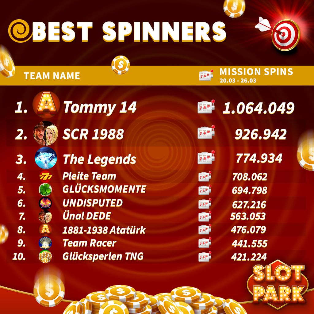 Competition Dates: 20.03-26.03 The Top 10 Teams with the highest number of Team Missions Spins are rewarded with a well-deserved bonus! Congratulations to all participating teams! It's easy to take part! 1. Spin as much as possible in Team Missions 2. Check the rankings every Friday 3. Be the …