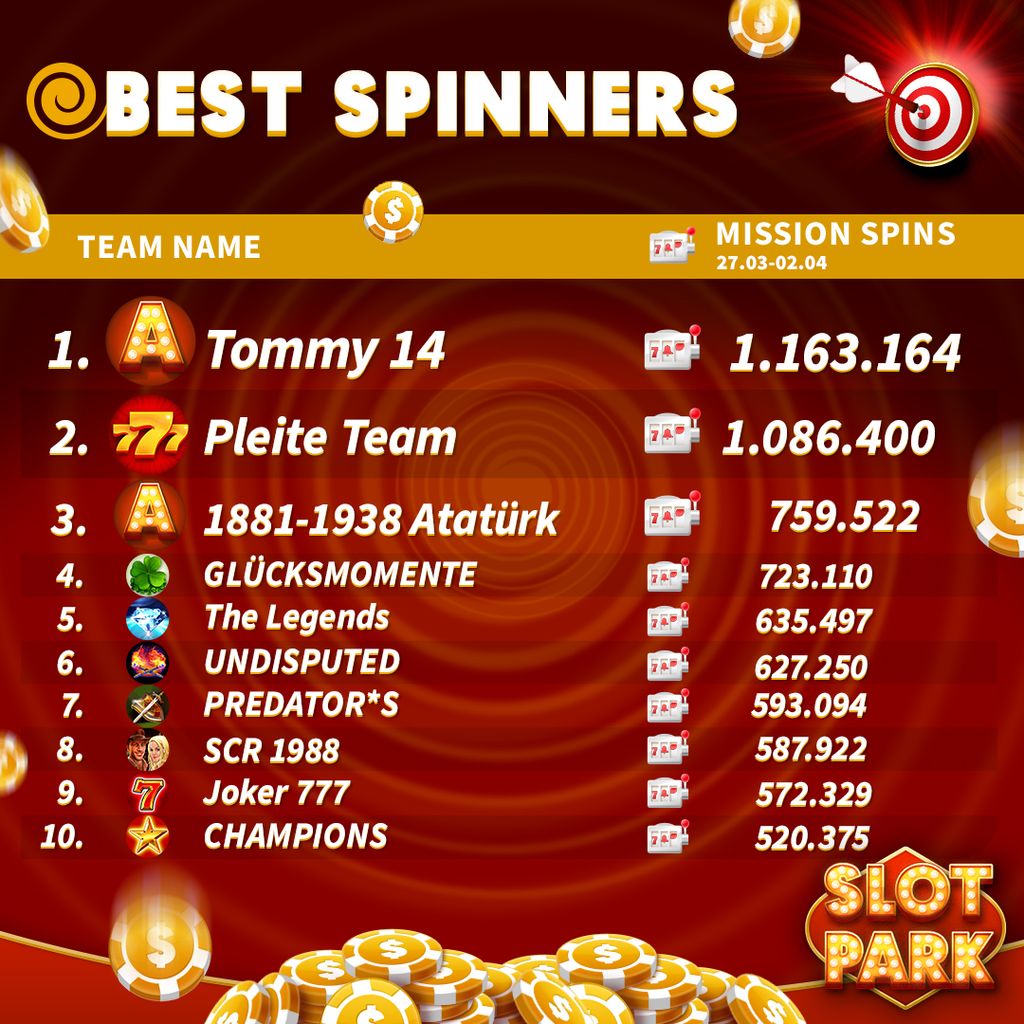 Competition Dates: 27.03-02.04 The Top 10 Teams with the highest number of Team Missions Spins are rewarded with a well-deserved bonus! Congratulations to all participating teams! It's easy to take part! 1. Spin as much as possible in Team Missions 2. Check the rankings every Friday 3. Be the …