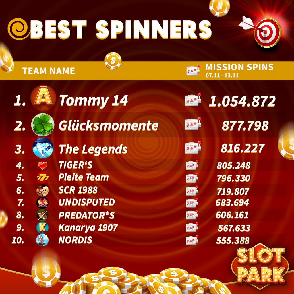 Competition Dates: 07.11-13.11 The Top 10 Teams with the highest number of Team Missions Spins are rewarded with a well-deserved bonus! Congratulations to all participating teams! It's easy to take part! 1. Spin as much as possible in Team Missions 2. Check the rankings every Friday 3. Be the …